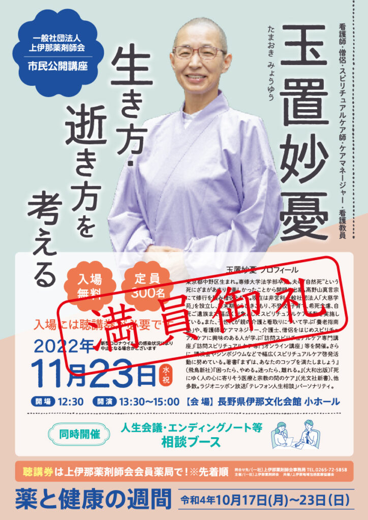 22.09.01 イベント 令和4年11月23日(水・祝)市民公開講座を開催します!※受付は終了しました ※定員に達したため受付は終了いたしました。 たくさんのお申込みありがとうございました。 2022年11月23日(水・祝)に、看護師・僧侶・スピリチュアルケア師・ケアマネージャー・看護教員の玉置 妙憂氏を講師にお招きして、市民公開講座を行います。 入場には聴講券が必要です。(無料) 聴講券のお求めは、上伊那薬剤師会会員薬局で先着順で配布いたします。 ふるってご参加ください。 ▶︎上伊那薬剤師会会員薬局の検索はこちらから 【開場】12:30 【開演】13:30~15:00 「生き方・逝き方を考える」 講師/玉置 妙憂(たまおきみょうゆう)氏 ◆看護師・僧侶・スピリチュアルケア師・ケアマネージャー・看護教員 【会場】長野県伊那文化会館 小ホール 【定員】300名 【入場】無料 イベントの記事一覧