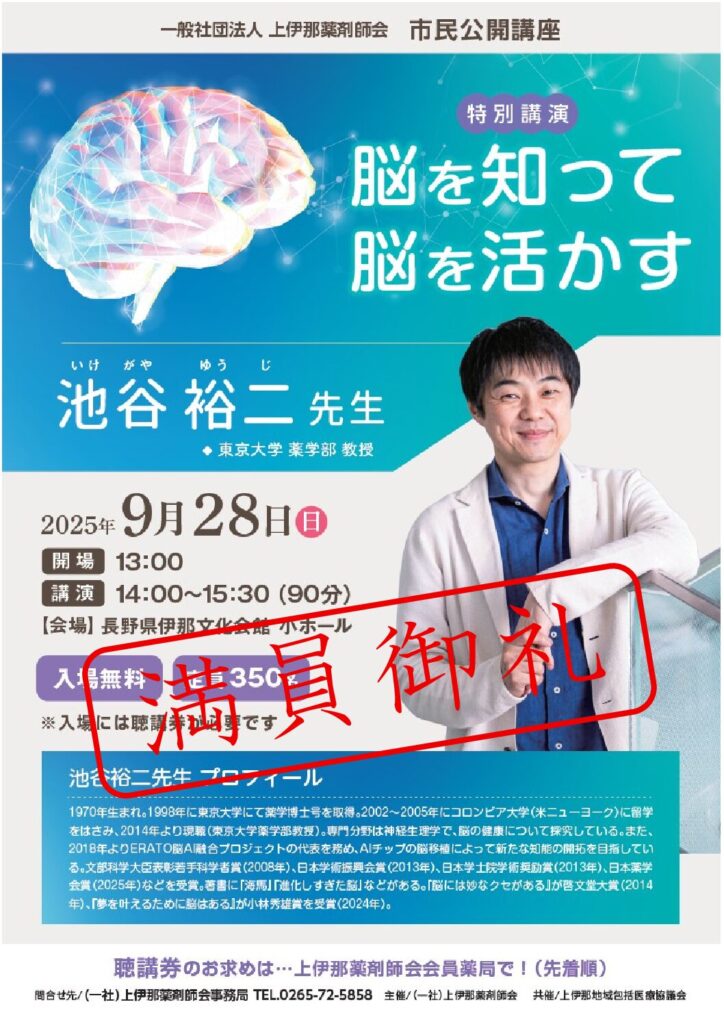 2025年9月28日(日)に、東京大学 薬学部 教授 池谷 裕二先生を講師にお招きして、市民公開講座を行います。