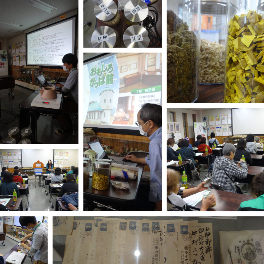 22.10.14 お知らせ 薬草観察会を開催しました 2022年9月23日、2年ぶりに『第34回上伊那薬剤師会薬草観察会』を開催しました。今回の会場は駒ヶ根市にあるおもしろかっぱ館。 およそ20名の皆さまにご参加頂き、「駒ヶ根のかっぱ伝説解説」「おもしろかっぱ館と加減湯」「黄檗」「加減湯と現在主に用いられている関節痛の漢方薬について」の講演が行われました。 また、漢方薬の煎じ方の説明もあり、防己黄耆湯を煎じて試飲を実施!「おいしい!」と感じられた方が多くいらっしゃいました。 今回は台風の影響で残念ながら周辺散策は行えませんでしたが、来年は外で実際の植物を観察しながら開催できたら良いなと思います!! ご参加頂いた皆さま、ありがとうございました。 お知らせの記事一覧